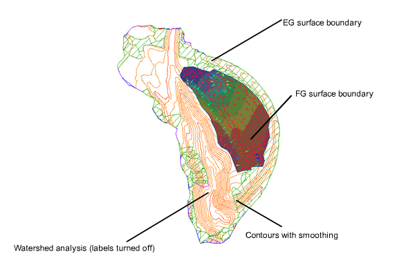 You can define different sets of contours, for example, for different intervals. Smoothing is provided for the surface object as a whole, which gives better results than simply smoothing the contours. In Autodesk Civil 3D, the build process for surfaces is incremental. Whenever data is added or corrected, the surface is updated. Each surface has a definition list. This list contains all the operations performed on the surface. By turning the operations on and off, you can return a surface to a previous state or modify it to support different types of analysis.