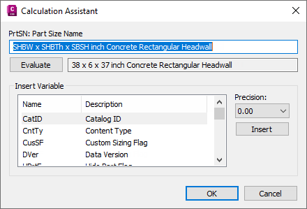 The calculation strings associated with parameter values are displayed. For example, the calculation formula for a Part Size Name (PrtSN) for a structure could be “SHBW x SHBTh x SBSH inch Concrete Rectangular Headwall”. Or for a pipe, it could be FormatNumber($PID,0) + “ inch Concrete Pipe”.