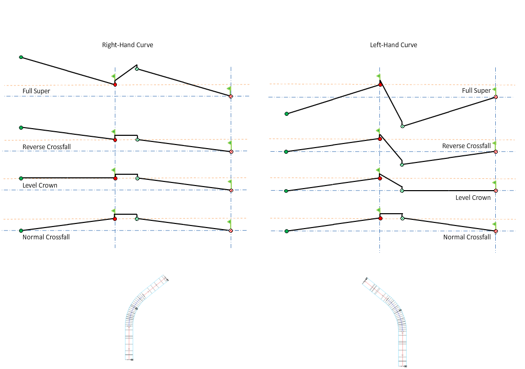 For an explanation of superelevation diagrams, see About Superelevation Axis of Rotation Pivot Methods.