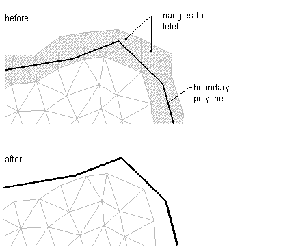 When you create a boundary with non-destructive breaklines along the edges of the boundary, the triangle edges are clipped exactly where they cross the boundary: