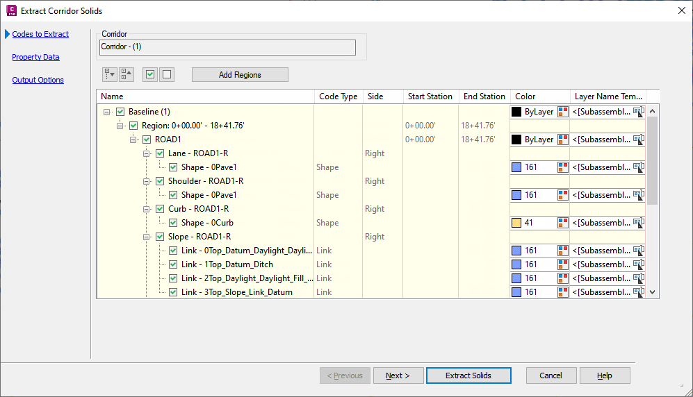 Select corridor regions to export as solids or [Chainage range within Polygon All regions]: