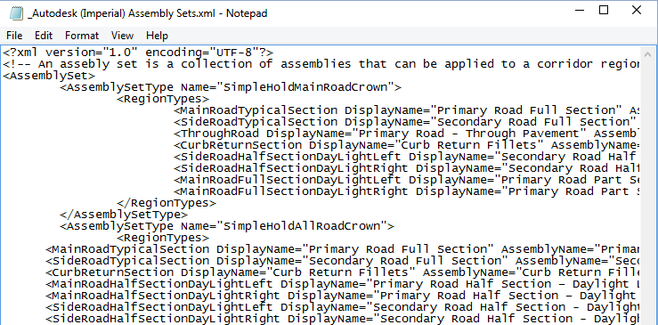 The following illustration shows the contents of the default assembly set file that is included with Autodesk Civil 3D.