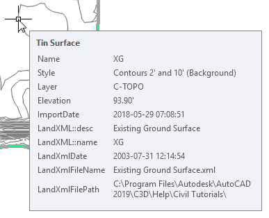 You can specify whether property set definitions are created and applied when surface data is imported from a LandXML file. For more information, see Import Tab (LandXML Settings Dialog Box).