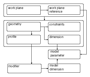 The following illustration shows the features that make up the model. Arrows indicate the direction of the relationship between features. For example, modifying geometry affects a profile, which affects a modifier, and so on. Refer to this illustration as you learn more about each feature to help you understand the relationships between features.