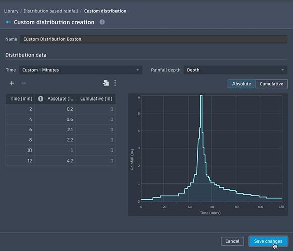 Custom distribution creation defines rainfall distribution (temporal pattern) for distribution-based rainfall events.