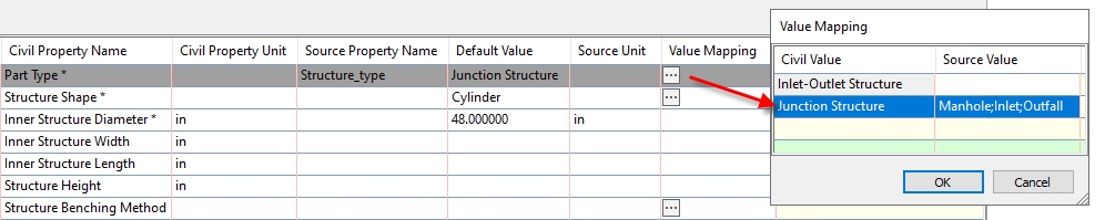 For each Civil Value listed, you can enter a Source Value that was assigned to the ArcGIS attribute. If the Source Value is found for a part in the source, the Civil Value will be applied to that part.