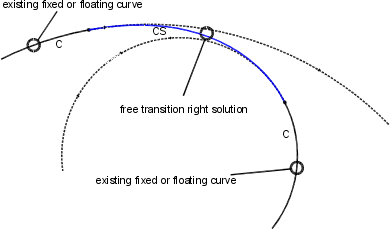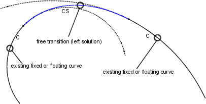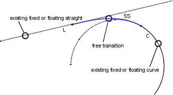 Use this command in situations where you need to create a single compound transition solution as a transition between two curves with different radii. Because free transitions have only one geometric solution, you cannot specify length or A value. The program makes the calculation.