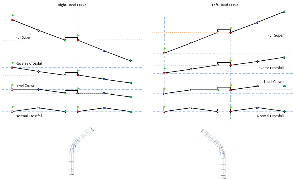 For an explanation of superelevation diagrams, see About Superelevation Axis of Rotation Pivot Methods.