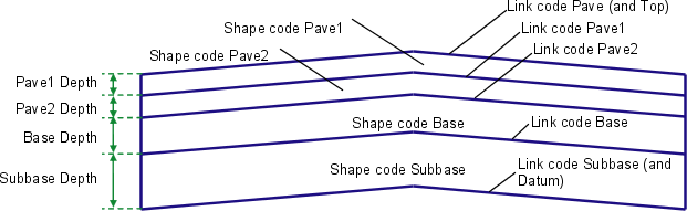 The standard link codes from top to bottom are Pave, Pave1, Pave2, Base, and Subbase. The code Top is also assigned to all finish surface links, thus coinciding with the Pave links on paved sections. The code Datum is also assigned to the bottom of subbase. The shape codes for the material areas from top to bottom are Pave1, Pave2, Base, and Subbase.