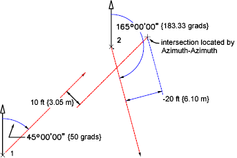 | whole circle bearing 1, whole circle bearing 2 | The whole circle bearings for the lines from the existing points (point 1 and point 2). Whole Circle Bearings establish a direction for each vector and are expressed in current angle units. |