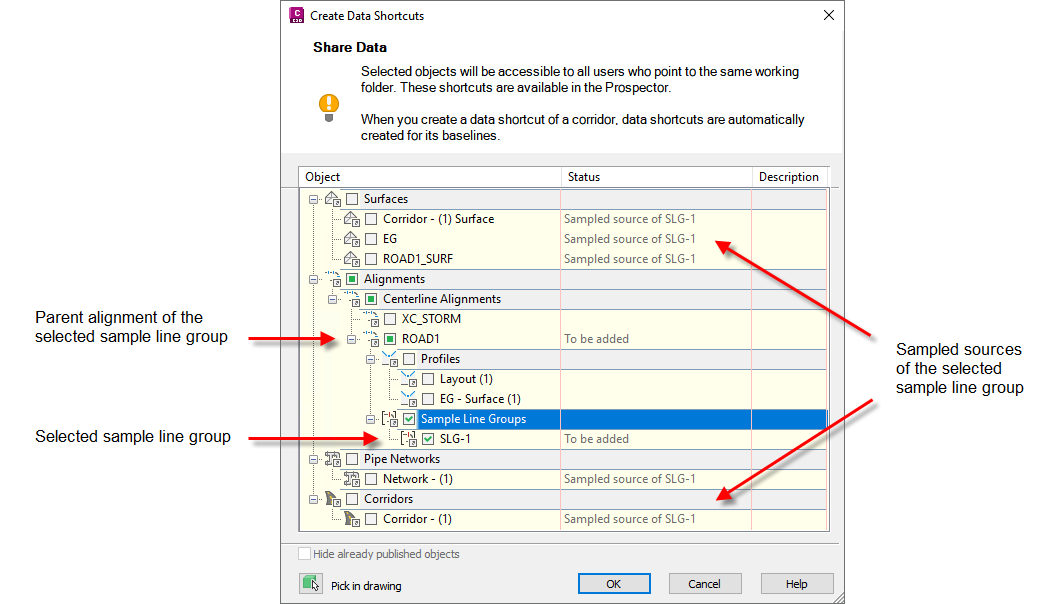 When you create a data shortcut for a sample line group, notes appear in the Status column of the Create Data Shortcuts dialogue box to inform you which items in the drawing are sampled sources of the sample line group.