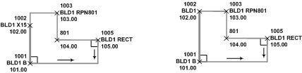 Continues an active figure BLD1 to the current point, extends the current segment 10.1 units, and then draws perpendicular segments for each value. Offset values, <Extend>, or <Rectangle> codes follow the <Right turn> code. Positive numbers indicate a jog to the right and negative numbers indicate a jog to the left. Note: