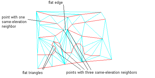 The multiple contours condition, which occurs when a point has more than two neighboring points with the same level, generally happens in a flat area of the surface. When this condition is detected, you can use the Minimize Flat Areas operation to correct the problem. If the point is on the surface border, the flat area can simply be an unintended artifact of the triangulation process. You can remove these unintended triangles by using the Delete Line operation or by adding a hide boundary.