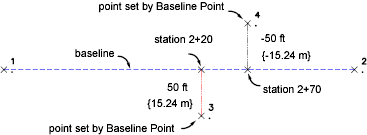 Point 3 is offset a distance of 15.24 to the right of the baseline at Station 2+20 and Point 4 is offset a distance of 15.24 to the left of the baseline at Station 2+70. Distances are in the current units, unless you type a qualifying suffix.