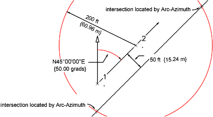 Intersections are located between an arc radius of 200 with its center at point 2 and a whole circle bearing of 50.0000 drawn from point 1 with an offset distance of 50 to the right.