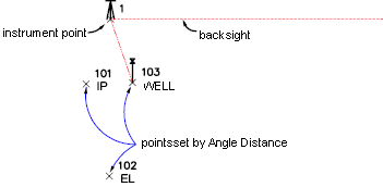 This example creates point 103, which is located by turning a horizontal angle of 80°20'40" right at a distance of 100 units from the instrument point with the description WELL. Because no method of vertical difference determination was given, the level is <Null>.
