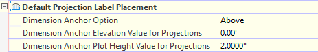 The Dimension Anchor Plot Height Value for Projections option controls the leader line height when the Dimension option is used for either the start or end anchor point in the projection or crossing label style. This value is in paper space units.