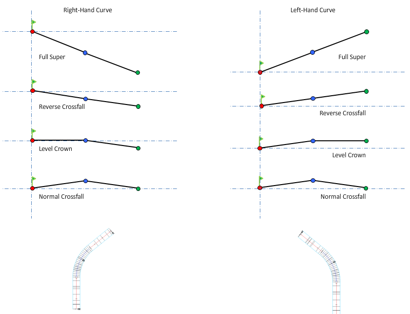 For an explanation of superelevation diagrams, see About Superelevation Axis of Rotation Pivot Methods.