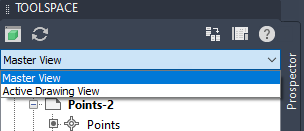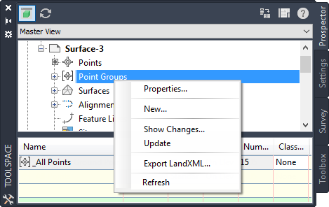 The Toolspace window is an integral component in the user interface for accessing commands, styles, and data. Use it to access the Prospector, Settings, Survey, and Toolbox tabs. Right click each collection or item on these tabs to access commands.