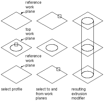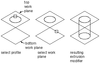 A plane extrusion sweeps a profile between the profile itself and a specified work plane. If the work plane is a reference work plane, the extrusion is updated when the work plane is moved.