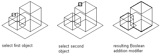 A Boolean add modifier combines two features to create a single feature. This modifier assumes a basic concept of addition: that geometry inside other geometry, when added together, is removed. This modifier is helpful when creating models of parts that are placed in your drawing exactly as they were created in the model.
