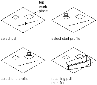 A path modifier sweeps a profile along path geometry. It creates a 3D feature based on the start and end profile of a piece of geometry, such as a line or an arc. The start and end profiles can be different.