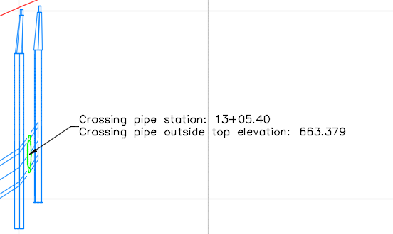 If the crossing pipe is moved to a different chainage along the alignment, the labels will be updated with the new chainage and level information.
