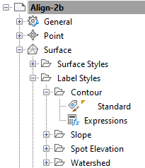 The hierarchy that label style settings use can be best viewed in the tree structure in Toolspace, shown in the following illustration.