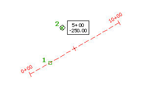For the selected alignment (1), you specify the XY location of the desired point (2). If the alignment is moved, the point’s X-Y location is maintained, but the labels update to show new chainage and offset distances.