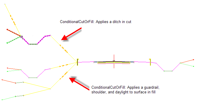 For example, a conditional corridor assembly could contain two ConditionalCutOrFill subassemblies. The first ConditionalCutOrFill subassembly can be configured to apply a ditch subassembly when a cut condition exists. The second ConditionalCutOrFill subassembly can be configured to apply a guardrail, shoulder, and daylight to surface when a fill condition exists. Using conditional subassemblies enables you to reduce the number of corridor regions and assemblies that you have to maintain.