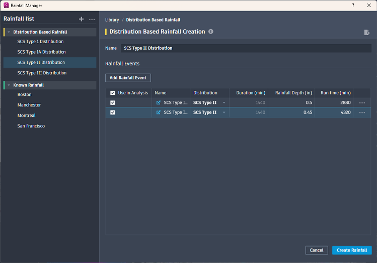 - Click Create Rainfall to save the Distribution Based Rainfall set. The Rainfall List displays the new rainfall set.