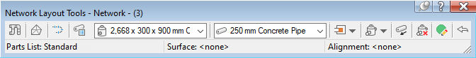 The names of the parts list, surface, and alignment referenced in the currently selected pipe network are displayed at the bottom of this toolbar.