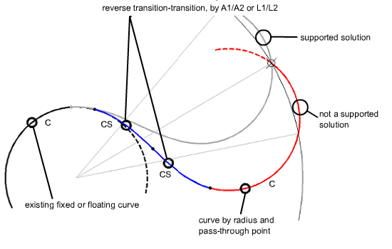 To add a floating reverse curve with transitions (from curve, radius, through point) off a curve