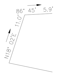 The following example shows how you can use the Line By Direction and Distance command to draw a line from the endpoint of a previously drawn line, at an azimuth of 86° 45', at a distance of 5.9 feet.