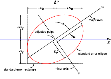 The following illustration shows that standard deviations represent half-dimensions of the standard 68% probability error rectangle around each point: