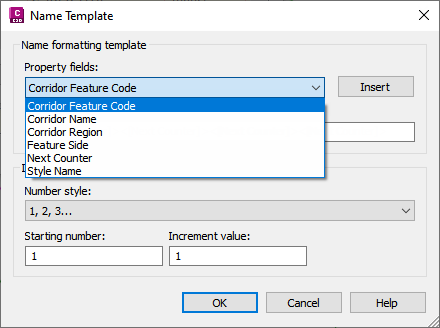 In addition to the Style Name and Next Counter properties, you can specify several properties for feature line names which help to identify them in relation to the parent corridor, including Corridor Feature Code, Corridor Name, Corridor Region, and Feature Side.