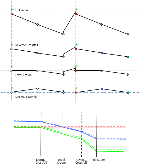 For an explanation of superelevation diagrams, see About Superelevation Axis of Rotation Pivot Methods.