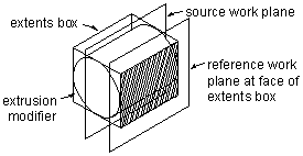 A reference work plane is defined as a plane on the face of the extents of a modifier. Every modifier has an invisible extent, or boundary box, that defines the extents of the feature. You can create a work plane that references one of the planes of the extent. To define a reference work plane, you select a modifier and a source work plane that represents the plane direction you want to create. The extents, or boundary box, of the feature is detected, and two valid reference work planes are available for selection. If the modifier is moved or resized, the reference work plane is moved with it.