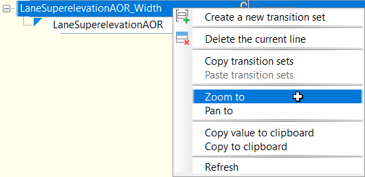 When you select the Edit Corridor Transition command, the Corridor Transition Panorama vista is displayed, and a prompt is displayed at the command line to select the subassembly to transition.