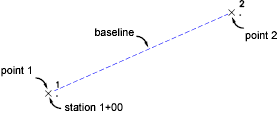 The baseline runs from point 1 to point 2. Point 1 is set as station 1+00. Direction and distances are in the current units, unless you type a qualifying suffix.