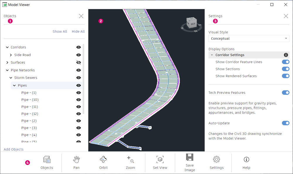 in the Viewer Toolbar. For more information, see Civil 3D Model Viewer Objects Panel.