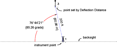 Point 3 is located by turning a deflected angle of 85.2657 right from the extension of the backsight line at a distance of 200. Angles and distances are in the current units, unless you type a qualifying suffix.