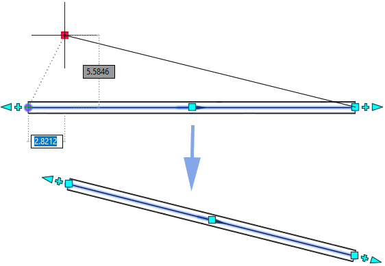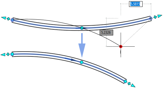 The following illustration shows a selected deflection grip and the visual cues as the grip is moved.