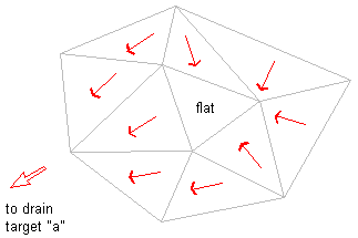 If some of the opposing, non-flat triangles slope down from the flat area boundary, but all flow to the same drain target, then the flat area is part of the watershed for that drain target “a”, as shown in the following illustration: