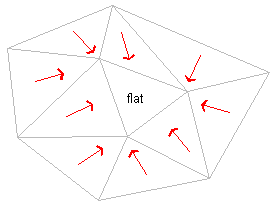 A flat area watershed is a flat area, from which water could flow down to more than one drain target. It also includes the parts of the surface that drain to that flat area. A flat area is a connected set of triangles all of whose vertices have the same level. Flat areas abut parts of the surface that slopes downhill.