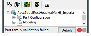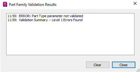 If you have errors in your model, the status bar message displays that the part validation failed, and a dialog box is displayed listing the errors. Review the errors, make necessary modifications, and repeat this step until validation is successful.