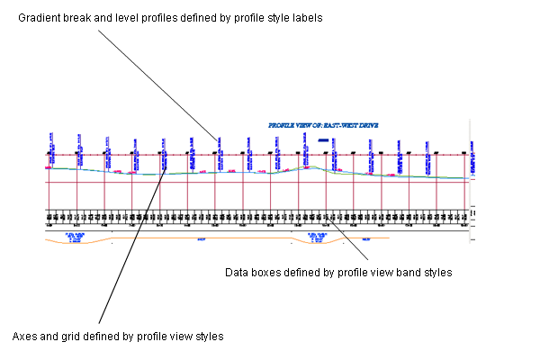 A profile view can include one or more related profiles, along with multiple data boxes along the X-axis, above or below the grid. Data boxes annotate the profiles with chaining, level, horizontal geometry, and other data that assists engineering analysis.