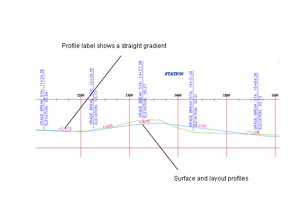Within a profile view, you can superimpose the profile of another alignment. For example, in the profile view for a road, you can superimpose the profile of a culvert that occupies the same corridor. By superimposing a profile, you can analyze culvert levels in relation to the same alignment chainages used for the road surfaces.