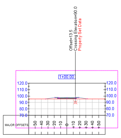 The following illustration shows an example of including property set data (in red) in a crossing label, where "property set data" represents the data you would apply to the feature line.