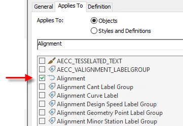 For most label types, on the Applies To tab of the Style Manager, select the object type you want to label, not the related object label type (for exceptions, see the following section). For example, to label alignments with property data, select Alignment when you set up the property set.